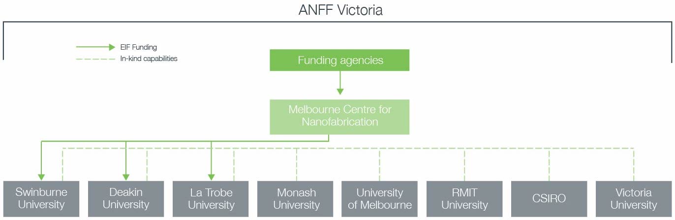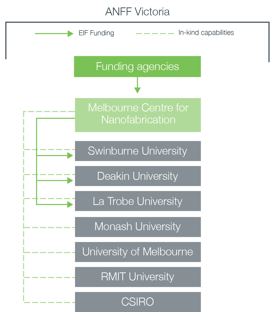The organisational chart below highlights the ANFF Victorian Node structure including infrastructure investment sites and the broader in-kind capability supporting network. For more information on each of the partners and their capabilities, click on the links above.