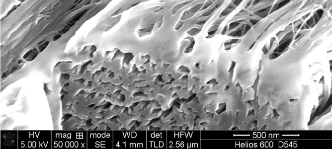 An example of the cross-section obtained by the FIB-SEM technique is shown above. To date, the researchers have developed a fabrication method that produces CNT yarns with a tensile strength of roughly 2.5 GPa, and the information obtained via the FIB-SEM cross- sectioning technique will enable them to further improve the fabrication methodology to produce yarns with even higher tensile strength.