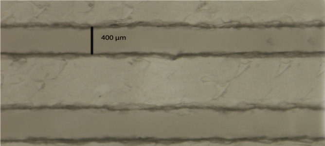 The project aimed to fabricate surface textures that enhance the settlement of mussel larvae, to improve capture of wild mussel spat and therefore profitability. Dr. Andrew Poole from CSIRO and Professor Rocky de Nys from James Cook University utilised the Eden 260V 3-dimensional printing system at MCN to create a fast, clean and accurate prototype of a polymer micro-structured surface. This flexibility in the rapid protoyping cycle allowed the collaborators to immediately change the texture design and produce new polymer surfaces to suit their research requirements. The image above depicts an image of the 400μm groove with 800μm spacing polymer structure that was produced on the 3-dimensional printing system. These surfaces are currently being used for trials at Queenscliff Mussel Hatchery (Department of Primary Industries).