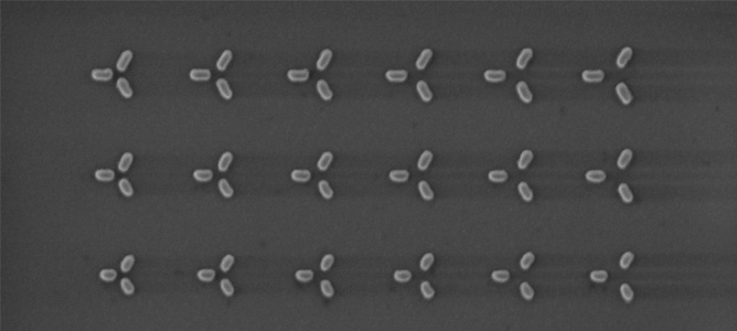 A Scanning Electron Microscope (SEM) image of a set of nanoparticles designed for capturing light. The basic design consists of an isosceles triangle of nanorods. Each nanorod is made of gold. By changing the sizes and separation among the nanorods, we can control which part of the solar spectrum get trapped by the nanoparticle trimer.