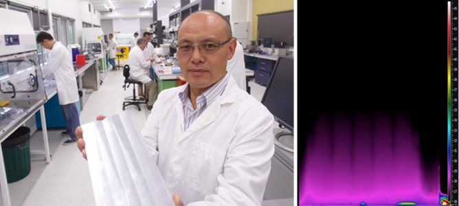 Left: A prototype heatpipe plate device developed at CSIRO held by Dr Yonggang Zhu; Right: the IR image of thermal conduction of the plate during start-up.