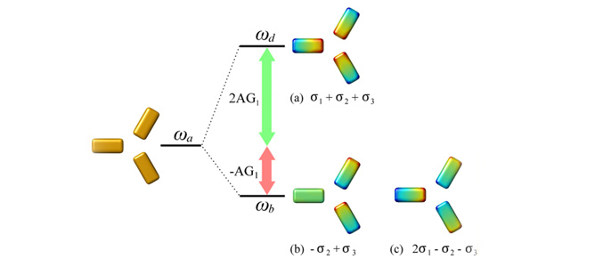 Three lowest-order modes of an interacting triangle of particles. Mode a) is the highest in energy of the three and is a mode with radial symmetry. Modes b) and c) are degenerate modes which are characterised by having a net dipole moment and perpendicular polarisations.