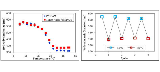 Preliminary work suggests that gold nanoparticles could be successfully incorporated into PNIPAM particles using a rotating mixer without destroying the stimuli-responsive properties of PNIPAM. To observe this, the hydrodynamic diameters and zeta potentials of Au-PNIPAM  nanoparticles were characterised under various temperatures using the Malven Nanosizer ZS at MCN. The results suggest that at a lower critical solution temperature, PNIPAM was not altered with the incorporation of gold nanoparticles which range in size from 3.5nm to 45nm. The size of the nanoparticles was confirmed via the use of the Field Emission Gun Scanning Electron Microscope.
