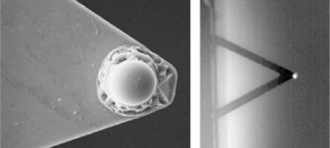 A difficulty in the present approach is working with wet and soft samples. In particular, working with soft samples implies a specific set up for modified cantilevers, in which a sphere is bound to the AFM cantilever (see image above). Tests will be conducted using breast cancer cells to improve this methodology and optimise the conditions for cantilevers. Cantilever optimisation experiments will utilise the cleanroom facility at MCN.