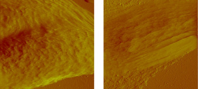 AFM deflection image of cancerous (left) and benign breast cells (right).