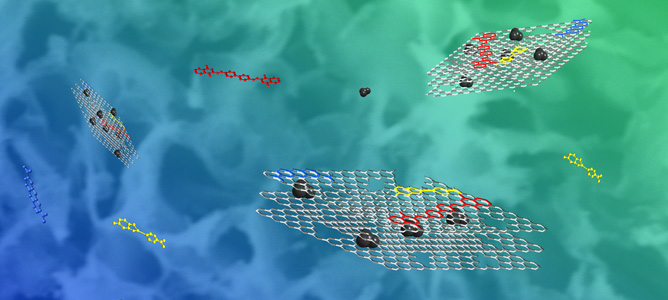 Artist’s impression of porous boron nitride nanosheets capturing oil and dye from water.