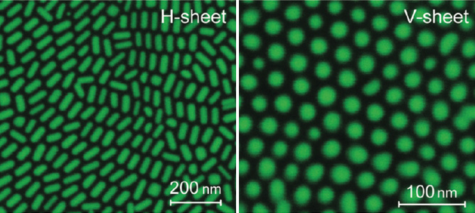 Plasmonic nanosheets from horizontally aligned gold nanorods (H Sheet) and from vertically aligned gold nanorods (V Sheet)