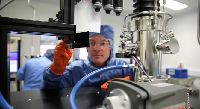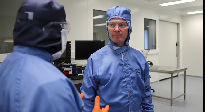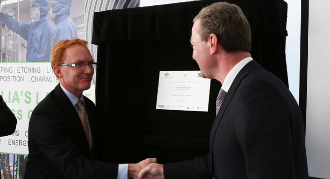 Diamond systems launch: Minister Pyne with MCN staff member Lachlan Hyde in the class 10,000 cleanroom
