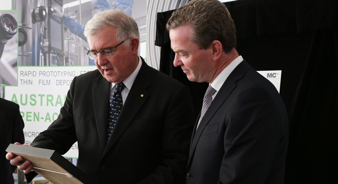 Diamond systems launch: Monash Vice Chancellor, Ed Byrne presenting Minister Pyne with a gift