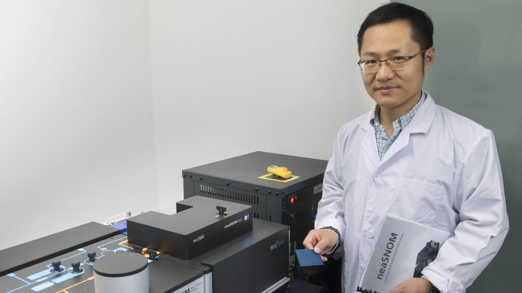 Qiaoliang Bao – ANFF-VIC Tech Ambassador for FLEET next to MCNs NeaSNOM. The scattering-type near-field optical microscopy facility was used for polariton measurements in the study.