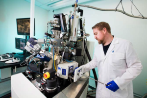 The Materials Characterisation and Fabrication Platform (MCFP) at the University of Melbourne operates a Zeiss ORION NanoFab helium ion microscope (HIM), one of only four in Australia. HIM is a scanned ion probe instrument that is similar in many respects to that of the well-established scanning electron microscope (SEM). The fundamental difference is clear in the name, with our source being one of (typically) helium ions generated from the gas field ion source, rather than electrons as in SEM. This affords benefits to the microscopist: we can image insulating materials without coating while maintaining high vacuum and high beam energy, we have outstanding surface sensitivity normally reserved for very low-kV SEM, and being an ion beam we can perform high spatial resolution fabrication switching between helium and neon as our source.