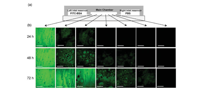 Congratulations to MCN staff member, Dr. Ricky Tjeung, as well as MCN Technology Fellows, Professor James Friend and Dr. Peggy Chan who co-authored the paper “In Situ Generation of Tunable Porosity Gradients in Hydrogel-Based Scaffolds for Microfluidic Cell Culture,” recently published in Advanced Materials. The paper shows that an anisotropic matrix, which allows users to alter its properties and structure in situ after synthesis, offers the important advantage of being able to mimic dynamic in vivo microenvironments, such as in tissues undergoing morphogenesis or in wounds undergoing tissue repair. In this study, in situ tunable porosity gradient on the chemotactic response of cancer cells is studied both in the absence and presence of chemoattractant. This platform illustrates the potential of hydrogel-based microfluidics to mimic the 3D in vivo microenvironment for tissue engineering and diagnostic applications. (see figure 2)