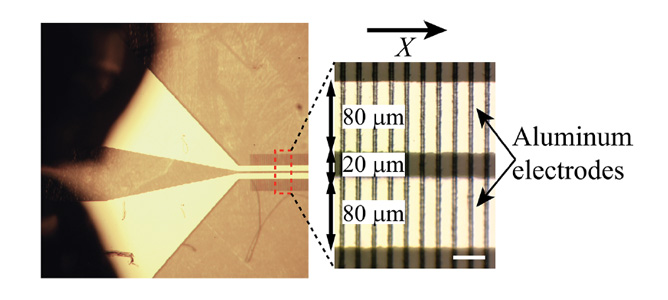Congratulations to Didit Yudistira et al who recently published “UV Direct Write Metal Enhanced Redox (MER) Domain Engineering for Realization of Surface Acoustic Devices on Lithium Niobate” in Advanced Materials. The paper looks at a new and highly versatile domain patterning method—ultraviolet direct write metal enhanced redox (UV direct write MER)— to achieve deep domains with practically no thermally-induced damage on the surface of lithium niobate crystals. This new technique enables the fabrication of practical piezoelectric acoustic superlattice structures on the most widely used crystal cut for surface acoustic wave applications. This is the first demonstration of a UV direct write surface acoustic wave transducer reported to date, made possible only due to the unique qualities of the MER domain engineering process. (see figure 3)