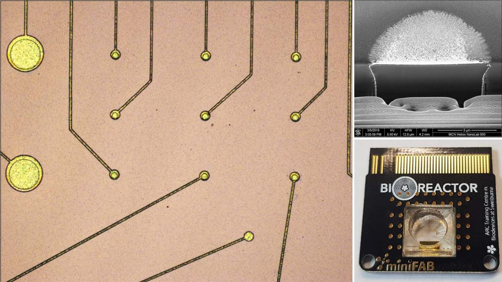 Inset image – Top: Labelled cross section, made using FIB-SEM. Bottom: Human stem cells on MEA Device.