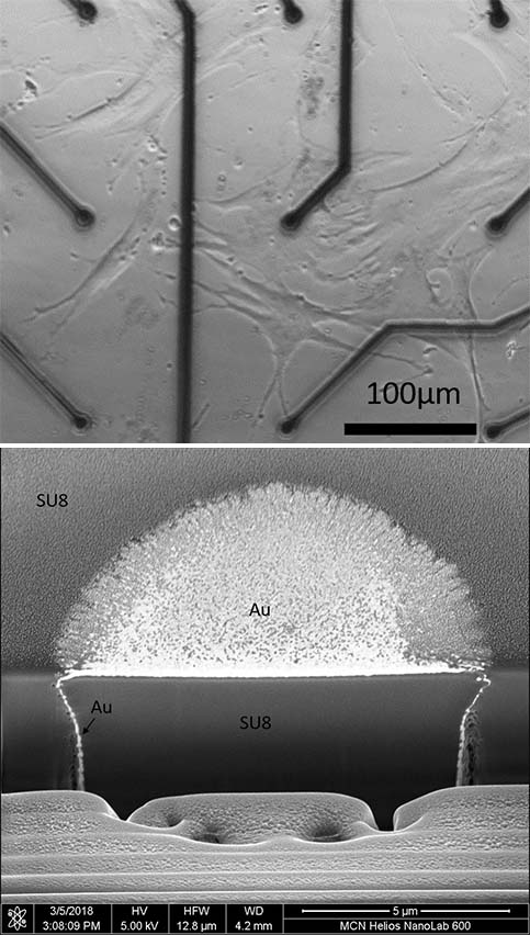 Header image – Left: Top view of MEA electrode array. Top Right: Cross section of device made using FIB-SEM. Bottom Right: The MEA Device.