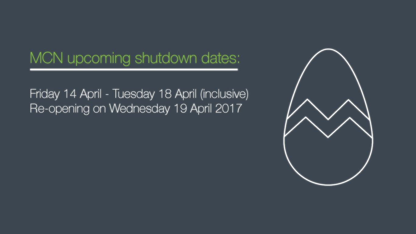 The MCN laboratories will be closed to users for the Easter shutdown from Friday 14 April – Tuesday 18 April (inclusive), and will re-open on Wednesday 19 April 2017